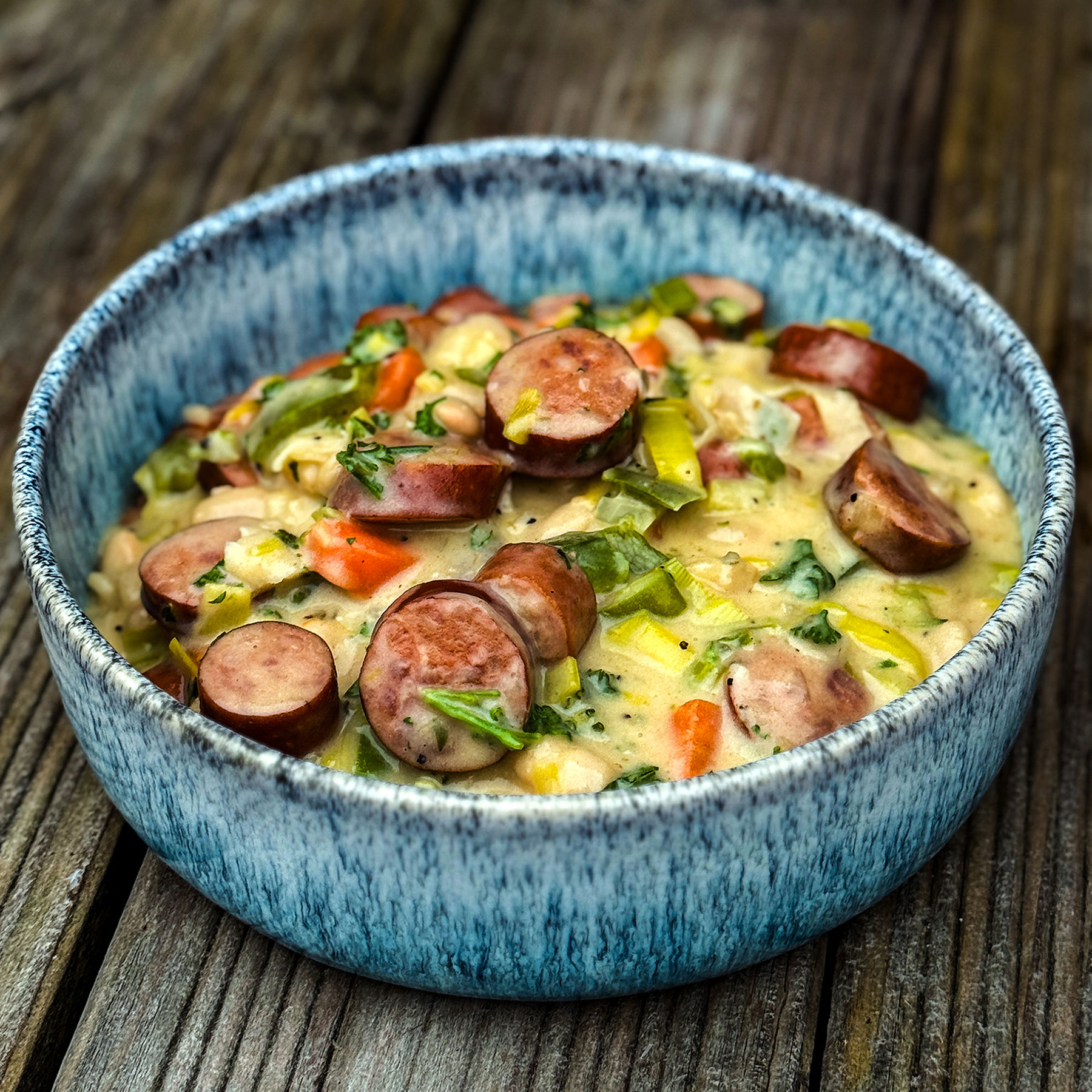 Der Bohneneintopf ist ein echtes Wohlfühlgericht, das einfach immer passt – egal ob an kühlen Tagen oder beim gemütlichen Grillabend. Deftige Würstchen, knackiges Gemüse und cremige Bohnen vereinen sich hier zu einem herzhaften Eintopf, der satt macht und gleichzeitig voller Geschmack steckt. Die Kombination aus Schinkenwürsten und würzigen Krakauern sorgt für eine kräftige Basis, während Paprika, Karotten und Lauch Frische und eine leichte Süße ins Gericht bringen.